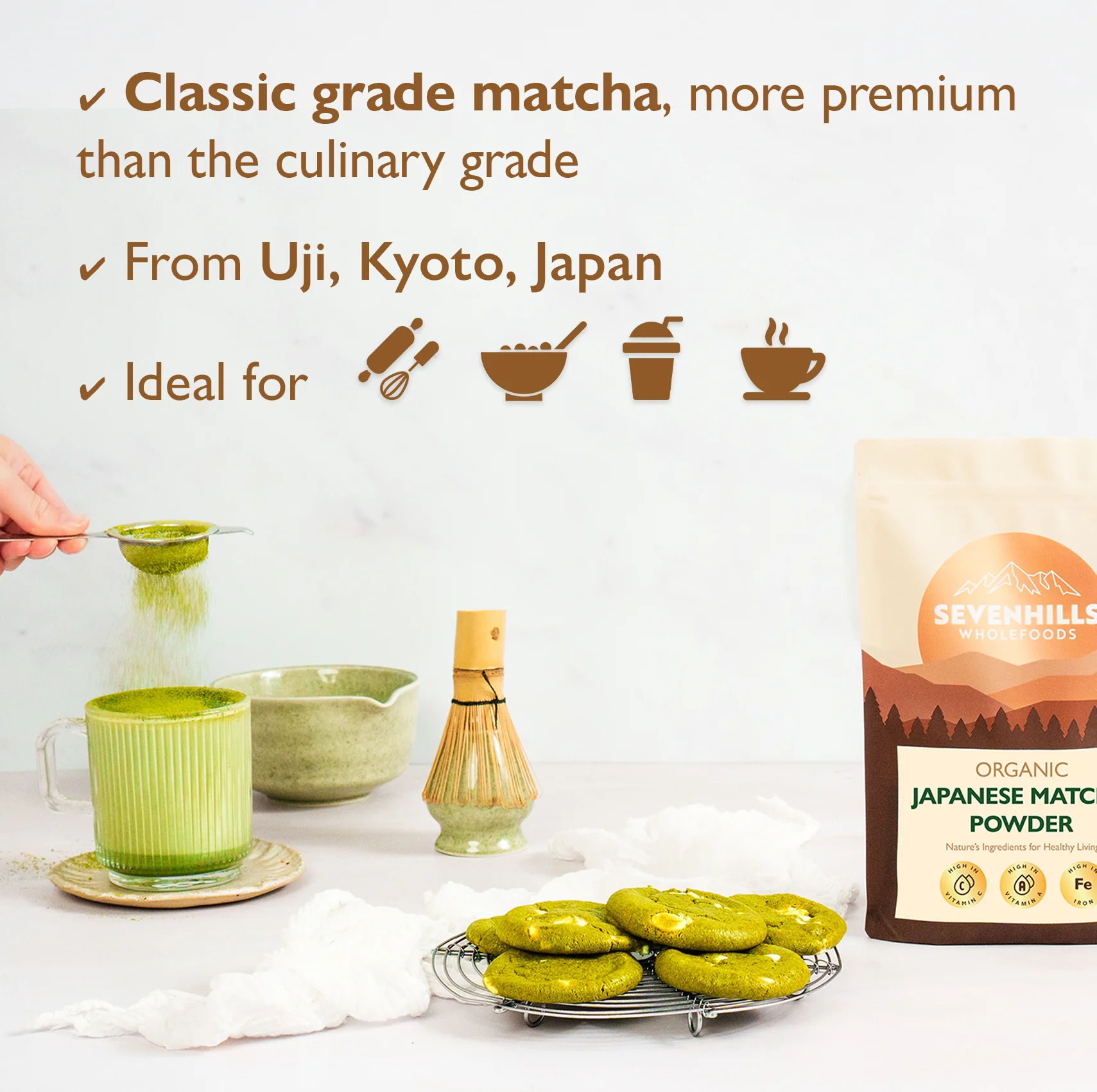 Our Matcha is from the oldest tea gardens of Kyoto, Japan, where the farmers have been growing matcha for generations. The finest tea buds are carefully picked and dried, before being ground to a fine-milled, bright-green powder. The tea leaves are shade-grown to stimulate Chlorophyll, and more theanine and caffeine is produced. Our Matcha is premium grade, or also known as latte grade.