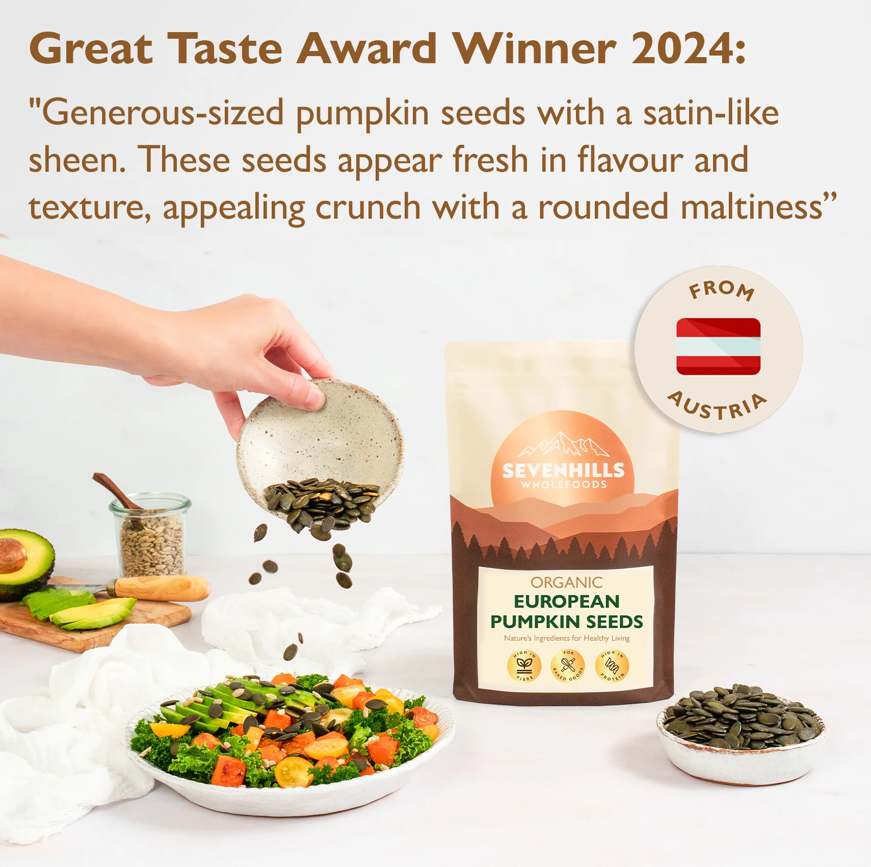 Great Taste Award Winner 2024:Ā Judges praised our pumpkin seeds for their attractive, generous size, noting their bright, fresh appearance. They highlighted the seedsā crisp snap and creamy interior, describing the flavour as fresh, grassy, and delightfully leafy with a rounded maltiness and a naturally sweet finish.