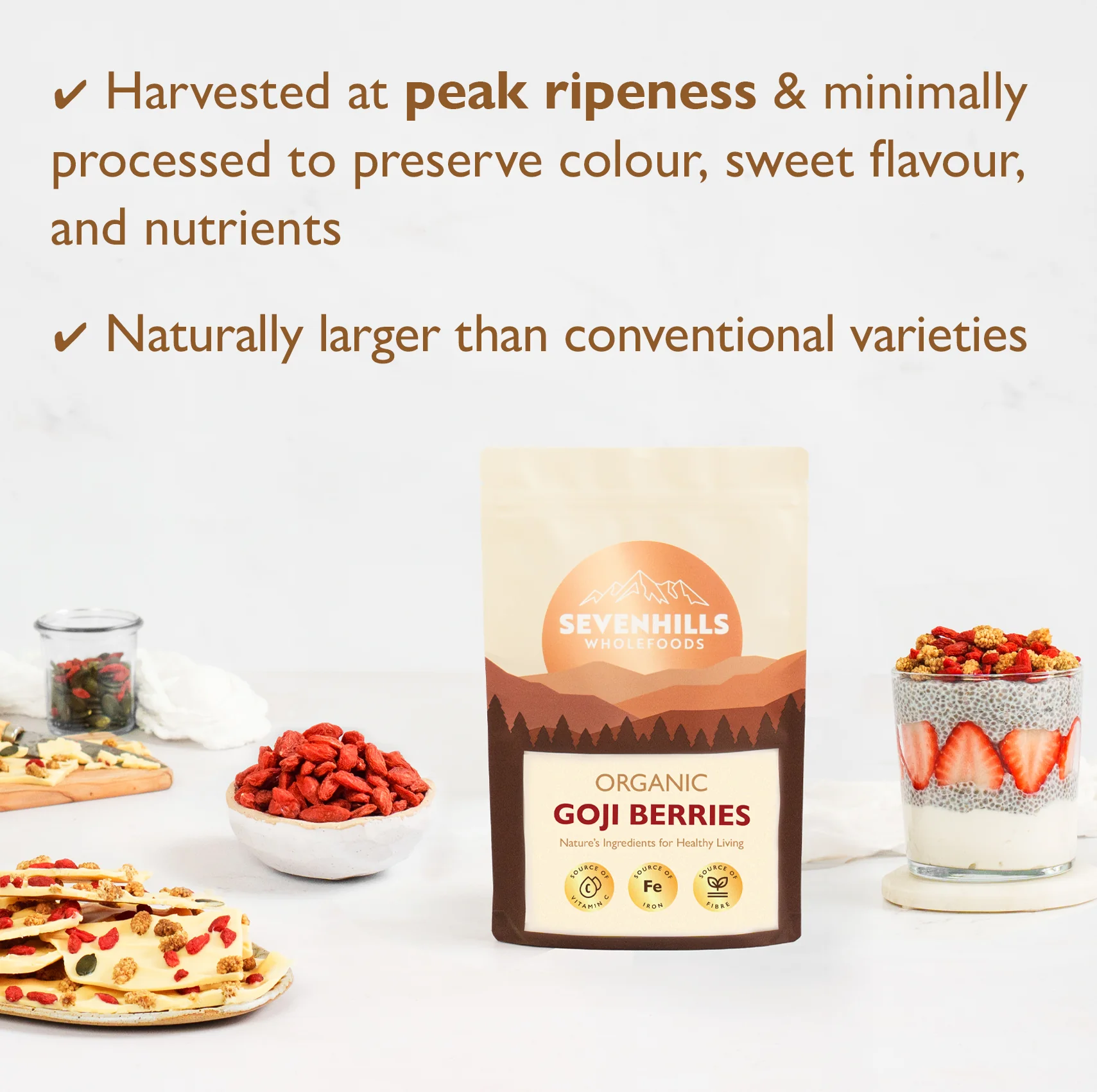 Our Goji Berries are grown in the pristine, mineral-rich alkaline soils of China’s Ningxia province — a region known for producing the plumpest, most nutrient-dense goji berries in the world. Harvested at peak ripeness, each berry is carefully cleaned and gently processed at temperatures below 45°C to lock in its vibrant colour, sweet flavour, and natural goodness.